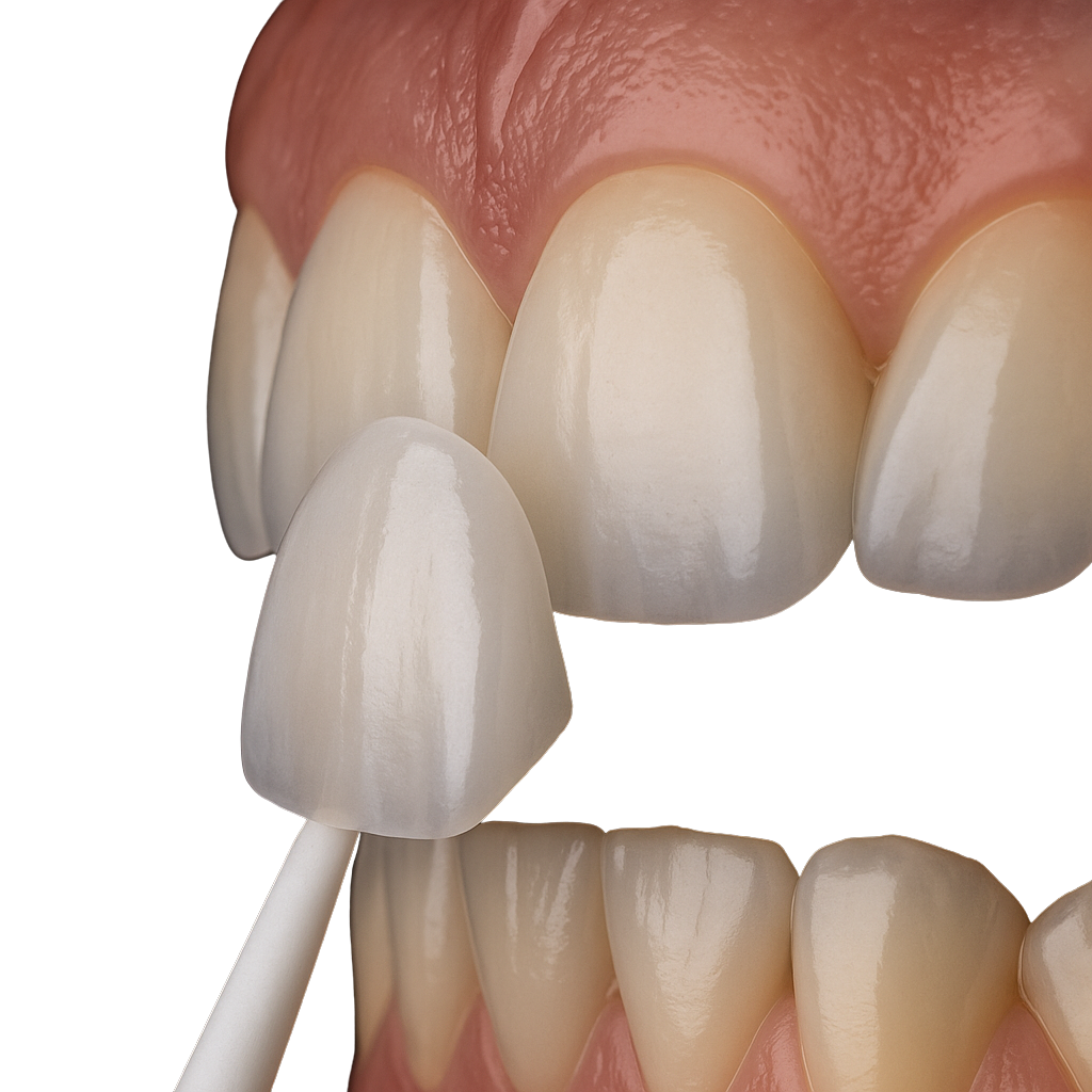 As facetas de porcelana são lâminas cerâmicas finas que recobrem somente a face visível (vestibular) dos dentes, com a finalidade de corrigir cor, forma, dimensões ou pequenas imperfeões estéticas. A estrutura dentária por trás costuma estar preservada, ou com desgaste mínimo, porque a técnica exige apenas um grau de preparo controlado. A fixação é feita por cimentação adesiva disponível em laboratório especializado.